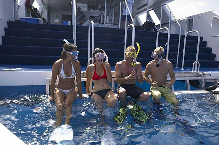 Your friendly professional crew and limited guest numbers will ensure a special reef experience, with activities including guided snorkeling, certified diving, ‘first-time’ introductory diving and marine talks. With the newest and most innovative craft on the Reef, incorporating the latest technology and best environmental practices, the craft offers air conditioned comfort, uninterrupted views of the reef, lounge style seating, open access to the wheelhouse and Skipper and a large partially shaded sun deck. Additional features include a huge dive deck with dive gear, snorkel gear, wetsuits and lycra suits, hydraulically lowered stairs and platforms, a sunken lounge and flat screen monitors throughout two levels. Fresh and hot water showers on the back deck add to the supreme comfort and convenience inherent throughout.