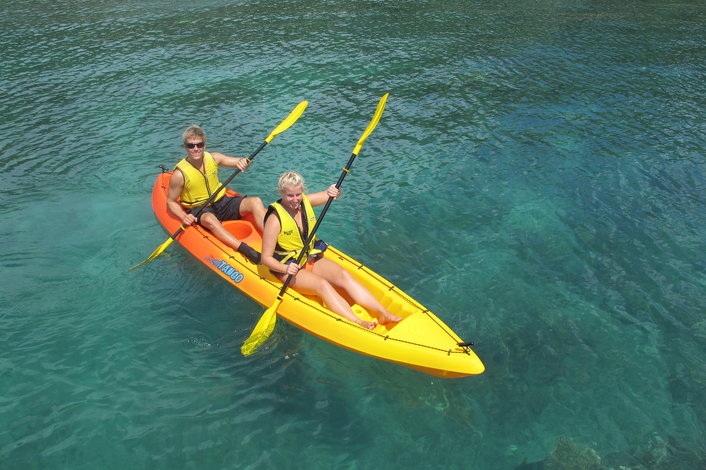 A choice of either a glass bottom boat trip, snorkel equipment (mask, snorkel and fins) for the day, 2 hour sea kayak hire or 2 hour paddle board is included.
